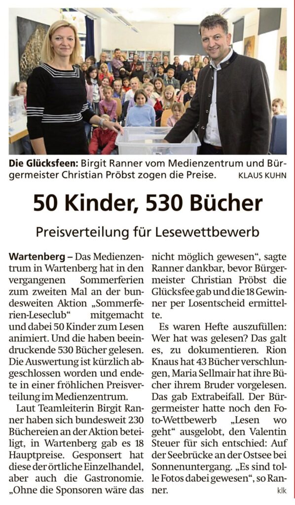 Am 28. September fand die feierliche Preisverleihung des Sommerferien-Leseclubs im Medienzentrum statt. In diesem Jahr haben insgesamt 44 begeisterte junge Leserinnen und Leser im Alter von 6 bis 13 Jahren an dem Programm teilgenommen. Gemeinsam haben sie, während der Sommerferien, 415 Bücher gelesen und damit ihre Begeisterung für das Lesen unter Beweis gestellt.