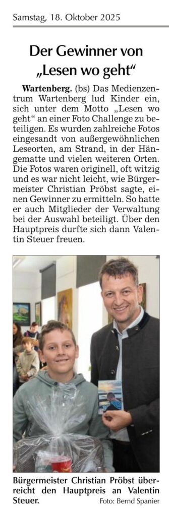 Zusätzlich wurde unsere Foto-Lesechallenge „Lesen wo geht“ durch den Bürgermeister prämiert. Wir hatten aufgefordert uns die besonderen Leseorte zuzusenden. Wir erhielten tolle Fotos von Lesen im Baum, auf Traktoren, während der Kletterpause oder im Meerschweinchen Käfig. Gewonnen hat hier Valentin Steuer, der auf der Seebrücke an der Ostsee während des Sonnenuntergangs gelesen hat. Er bekam den Sonderpreis ein Lesekissen und einen Gutschein