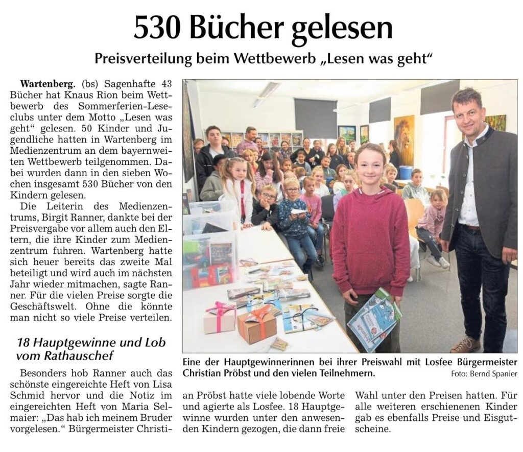 Gewertet wurde nicht nach gelesenen Büchern, sondern allein das Los hat entschieden. Der Spaß am Lesen soll im Vordergrund stehen nicht die Menge. Die Glücksfee war unser Bürgermeister Christian Pröbst. Es gab 18 Hauptpreise, in Form von Gutscheinen vom örtlichen Handel oder auch der Therme Erding. Dank vieler Sponsoren, bekamen aber alle die bei der Preisverleihung dabei waren eine Kleinigkeit, mit dabei immer ein Gutschein über eine Kugel Eis von unserer Eisdiele am Markt. Ohne den vielen Sponsoren, wäre dies natürlich so nicht möglich gewesen.